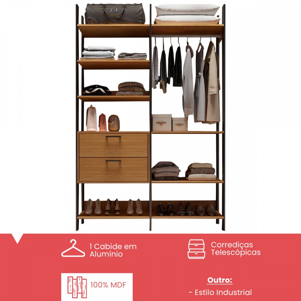 Closet 2 Gavetas 8 Prateleiras 100% Mdf Tw403 Freijó/Preto Fosco - Dalla Costa